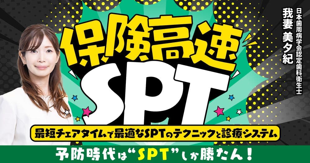 このセミナーでは「保険高速 SPT」をテーマに、SPT の定義を理解し、注意すべきポイントと時短のためのテクニックを学ぶことで、単なる「お掃除」にならない SPT が実践できるまでを日本歯周病学会認定歯科衛生士 我妻美夕紀先生に解説していただきます。